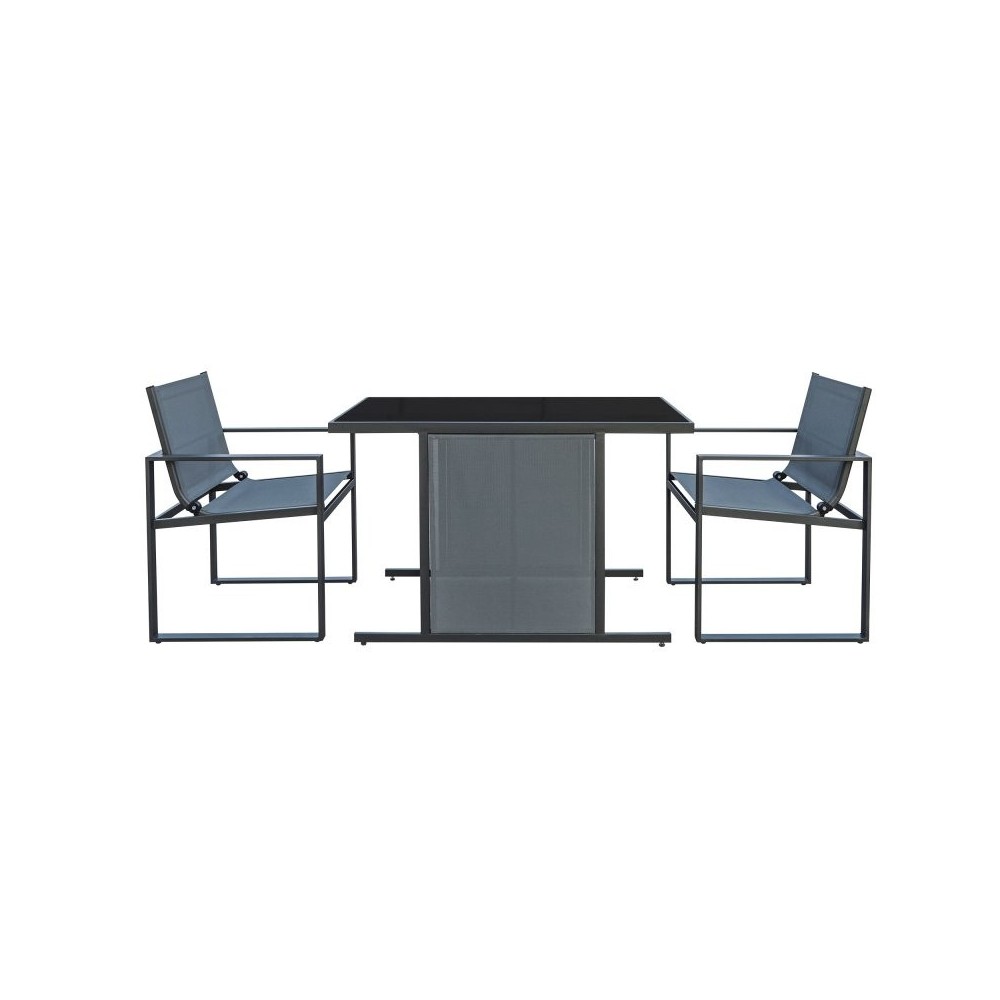 Rõdu - 3-osaline komplekt, metallraam, toolid ilmastikukindlate tekstiilkattega, turvaklaas, toole saab laua alla hoiustada, säästes palju ruumi