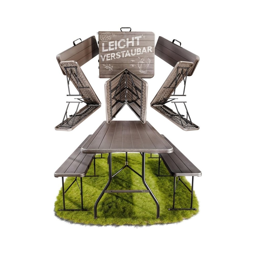 Ideaalne komplekt õlletelgi, telkimise või aiapeo jaoks; see volditakse kiiresti kokku. Paneelid on valmistatud plastikust ja neid on lihtne puhastada. Metallraam volditakse kokku ja kõik saab mõne minutiga hoiule! Kuna kogu komplekt on nii kerge ja mugava suurusega, saab selle kiiresti pakiruumi kokku panna ja see sobib ideaalselt piknikuks.