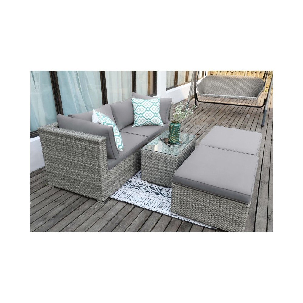 See Sonora diivanikomplekt, mis on sama ilus kui tema nimekaim, avaldab muljet oma elegantsi ja mitmekülgsusega. See õues, talveaias või esikus kasutamiseks mõeldud mööbel on moodsa rotangist korvi imitatsiooniga, mis püüab pilke igas ruumis. Komplektis on ka selja- ja istmepadjad. Neil on lukk, seega on kate pestav. Padjad on valmistatud vahust. Mööbel seisab kindlalt ja tuul ei puhu seda kergesti minema. Samal ajal pole see liiga raske. Täielik viiekohaline komplekt kaalub vaid u. 46 kg. See tähendab, et üksikuid toole või pinke saab hõlpsasti tõsta ja varju viia, kui päike on liiga ere. Loomulikult on aiamööbel UV- ja ilmastikukindel, nii et see püsib ilus aastaid, isegi ilmastikuolude käes. Sonora komplekt on eriti muljetavaldav oma reguleeritavuse tõttu. Murul päevitamisest kuni kohvihommikuni – see komplekt sobib igaks sündmuseks ning üksikute osade kerge kaal tähendab, et seda saab sekunditega hõlpsalt ümber paigutada. Kokkupanek võtab aega umbes tund; tööriistu pole vaja. Komplekti kuuluvad kokkupanekujuhised. Nurgadiivani mõõtmed on umbes 90 x 70 x 62 cm, laua mõõtmed on umbes 70 x 40 x 36 cm ja kokkupandud jalatoe mõõtmed on umbes 80 x 60 x 28 cm. Kõik mõõtmed on ligikaudsed ja viitavad toote maksimaalsetele välismõõtmetele. Saatmiskaal on samuti ligikaudne. Täpsema teabe saamiseks võtke ühendust meie tugimeeskonnaga.