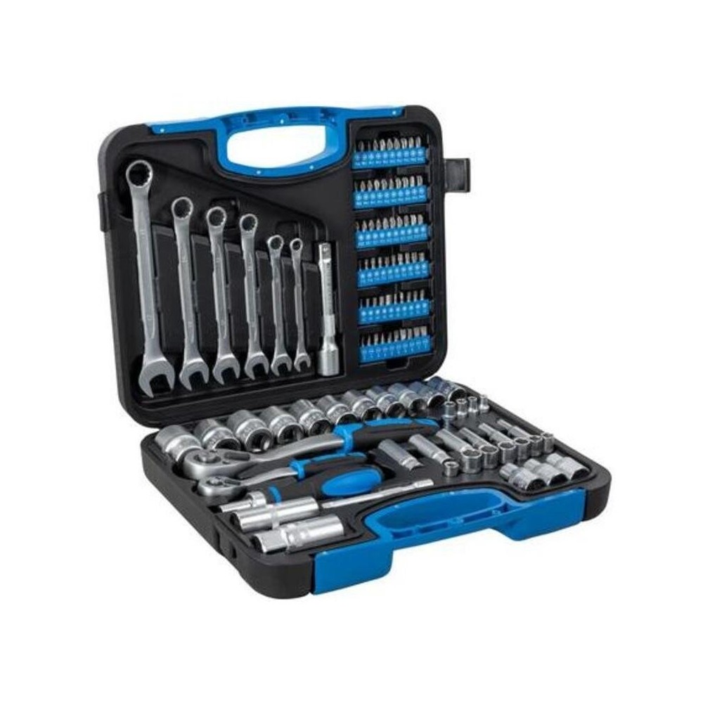 See tööriistakomplekt on praktiliselt pakitud 104-osalisse karpi. See sisaldab 2 räikvõtit (1/2" ja 1/4" 72 hambaga) koos sobivate lühikeste ja pikkade bittidega ning sobivate pikendustega. Suur valik bitte, hammasrattaga kruvikeerajaid, samuti kõik vajalikud adapterid ja 6 lehtvõtit muudavad selle komplekti täielikuks.