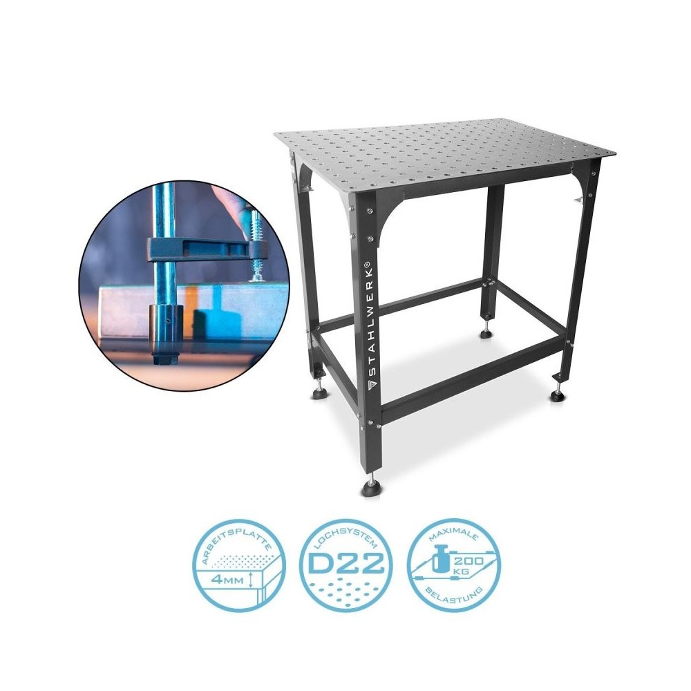 - Keevituslaud, mille tööpind on 915 x 610 mm, sobib ideaalselt mitmesugusteks keevitustöödeks. - Tugeva montaažilaua kandevõime on 200 kg, see on eriti vastupidav ja avaldab muljet suurepärase stabiilsusega. - 4,0 mm paksune tööpind ja pulbervärvitud jalad muudavad töölaua eriti vastupidavaks löökidele ja kriimustustele. Tsingitud pind pakub tõhusat kaitset korrosiooni eest. - Praktiline perforeeritud keevituslaua plaat 22 mm läbimõõduga avaga sobib ideaalselt tööriistade, näiteks kinnituskruvide või klambrite kinnitamiseks. - Tasandatud lauajalad tagavad selle stabiilsuse ja maksimaalse paindlikkuse keevitamise ajal. Tugevat lauaplaati saab kasutada ka jalgadeta keevituslauana. - Kvaliteetne viimistlus muudab keevituslaua sobivaks kõikideks keevitusprotsessideks ja on eriti sobiv kasutamiseks tööstuses, kaubanduses ja isetegemises.