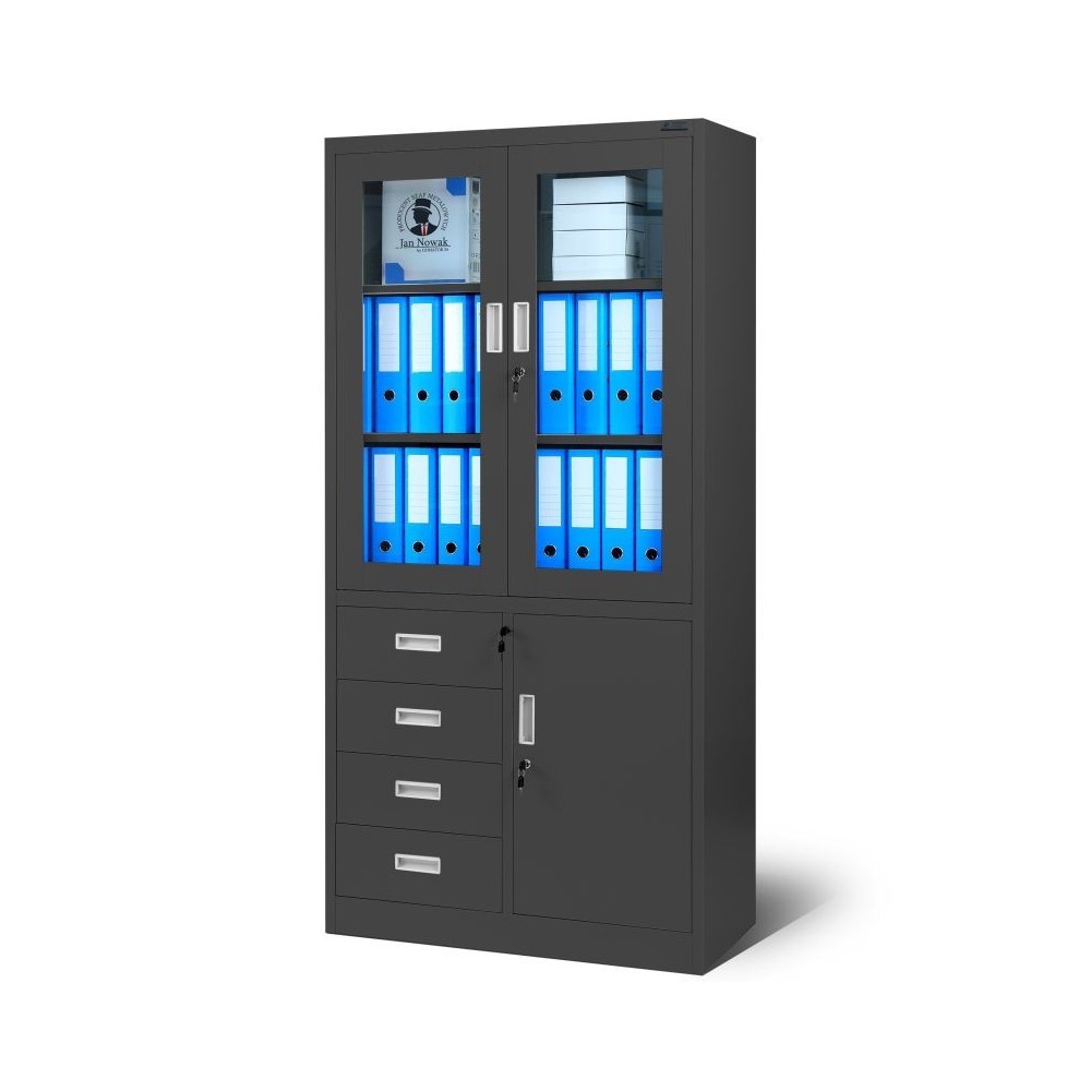 JAN NOWAK metallist kontorikapp klaasuksega ja sahtlitega WIOLA: antratsiit