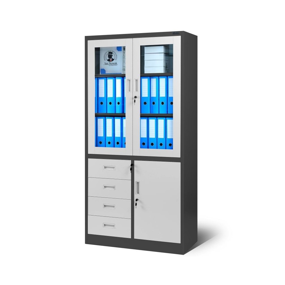 JAN NOWAK metallist kontorikapp klaasuste ja sahtlitega WIOLA: antratsiitvalge