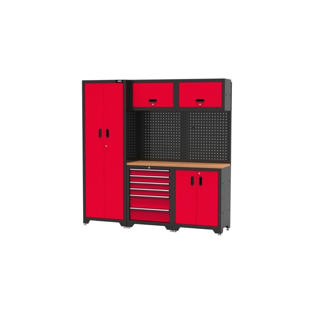 Selle moodultöökojavarustuse komplektiga on teil kõik töökojamööbli jaoks olemas. Komplekti kuulub suur avatavate ustega külgkapp, alumine kapp kuue sahtliga näiteks tööriistade jaoks, kaks ülemist kappi, väike kapp ja tagasein, millele saab lisaks konksudele riputada mis tahes tööriistu. Moodulkapi mõõtmed on 198,3 x 51 x 192,5 cm. Kaitseks on kasepuidust pealispind kaetud linase lakiga ja selle mõõtmed on 132 x 44.