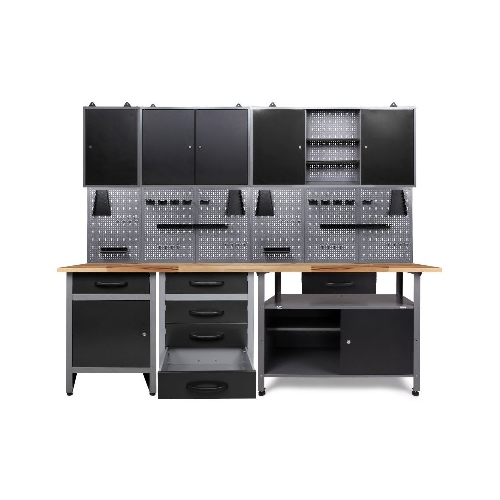 Töökoja varustus 240 cm - töökõrgus 85 cm - koosneb 3 x töölauast (Wolle / Bernd / Klaus), 3 x töökojakapist (42 cm / 80 cm / 120 cm), 6 x perforeeritud seinast, 2 x perforeeritud seinakonksude komplektist