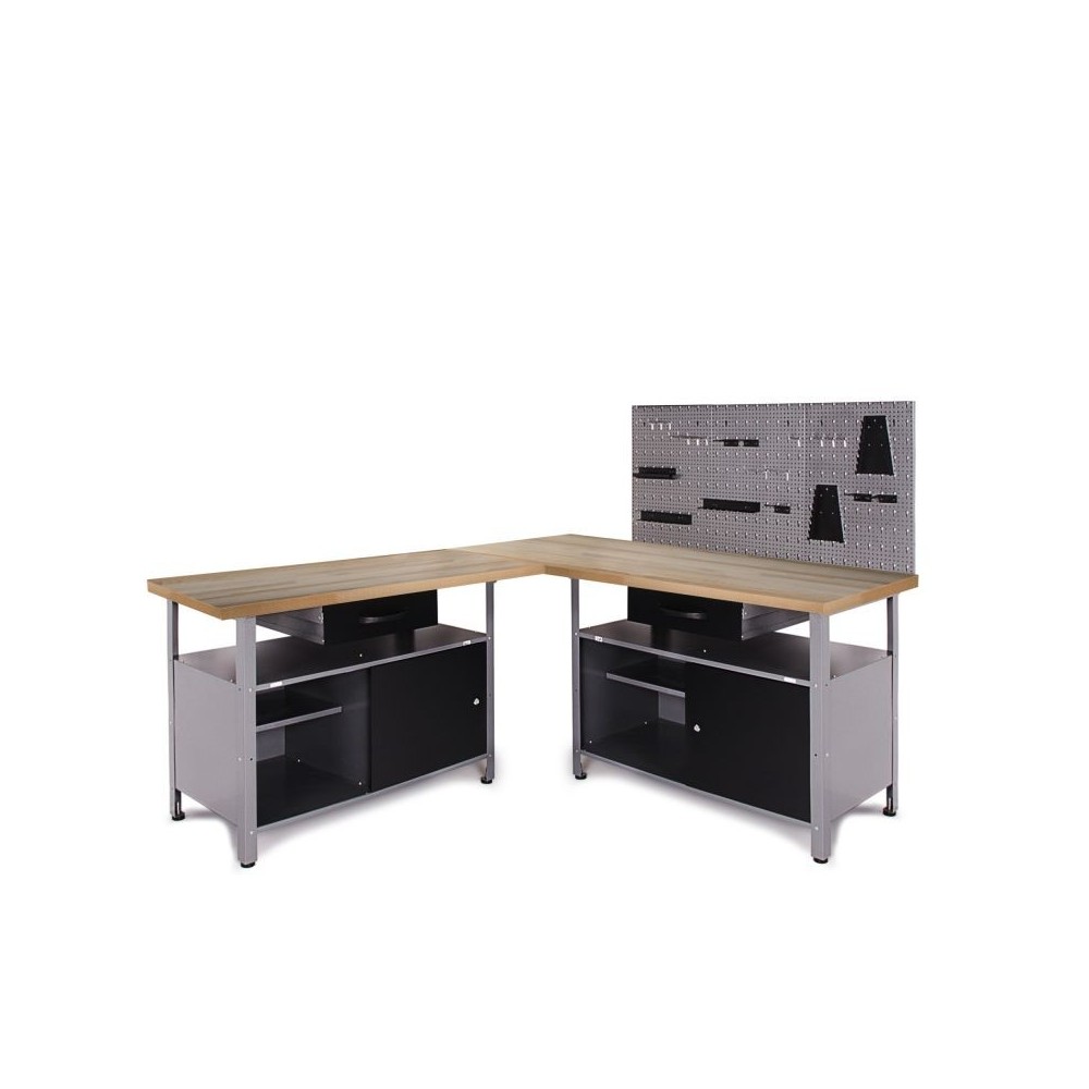 Töökoja seadmete nurgalahendus One - töökõrgus 85 cm - koosneb 2 x töölauast (Klaus), 3 x perforeeritud seinast, 1 x perforeeritud seina konksude komplektist