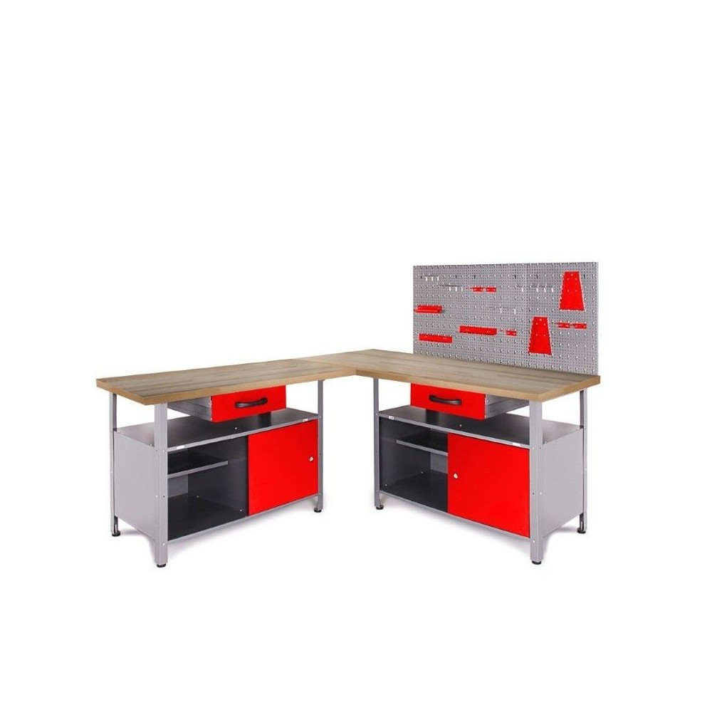 Töökojavarustuse nurgalahendus One red - töökõrgus 85 cm - koosneb 2 x töölauast (Klaus), 3 x perforeeritud seinast, 1 x perforeeritud seina konksude komplektist