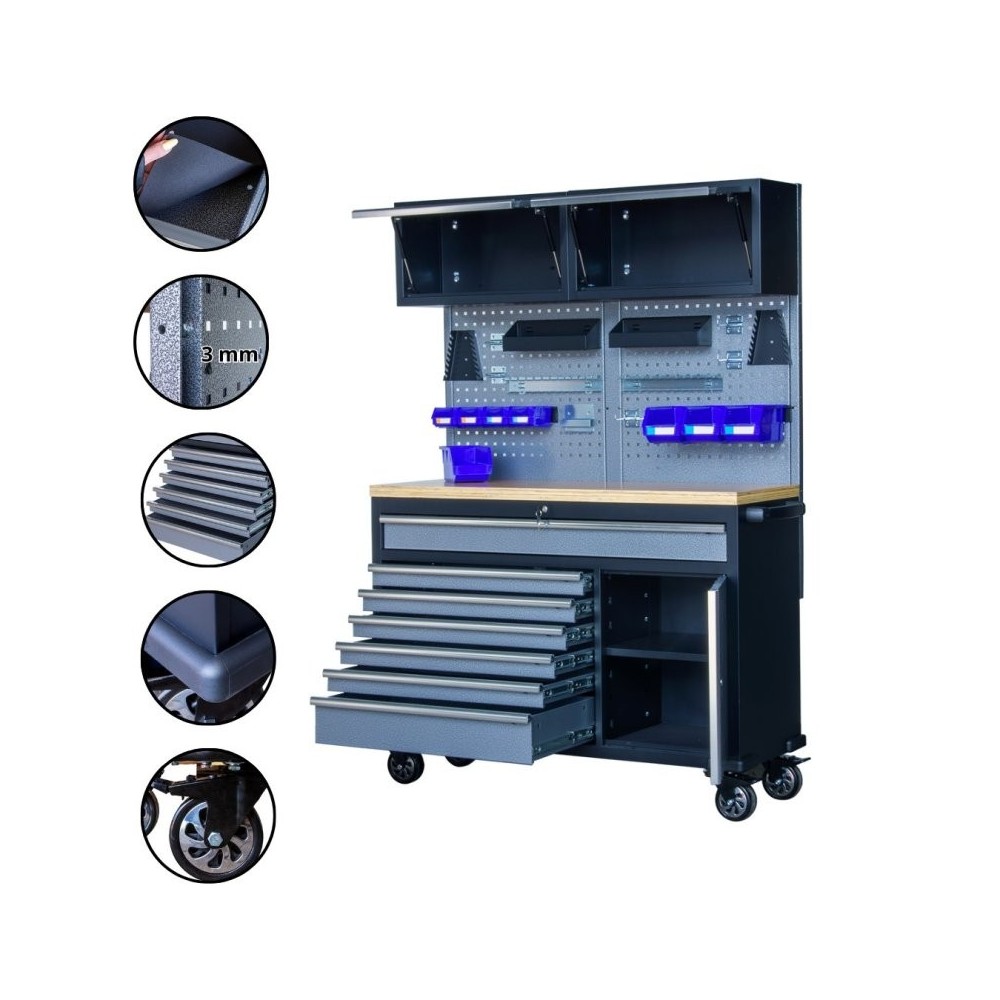 Viber-System M1360 on ainulaadse disainiga mobiilne töökojakäru, millel on funktsionaalne disain, mis ühendab endas võimsa hoiuruumi, ergonoomika ja vastupidava konstruktsiooni. See on loodud professionaalsetele töökohtadele, kus nii kord kui ka efektiivsus on esmatähtsad. Kogu seade on valmistatud pulbervärvitud tsingitud terasest, mis tagab kõrge vastupidavuse mehaanilistele kahjustustele ja korrosioonile. Tänu vastupidavatele komponentidele ja läbimõeldud disainile sobib M1360 ideaalselt töökodadesse, teeninduskeskustesse ja hobigaraažidesse.