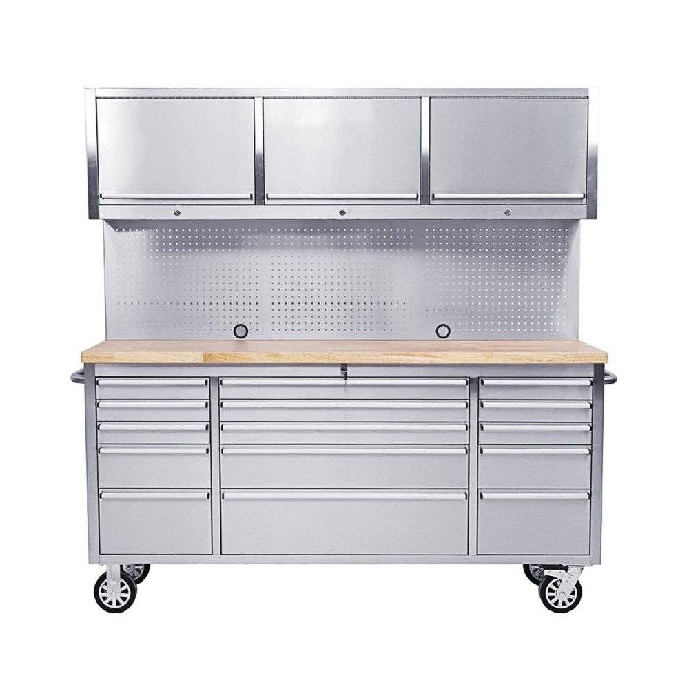 Avastage parim lahendus oma töökoja korraldamiseks meie eksklusiivse tööriistakäruga! Mõõtmed 183 cm (laius) x 46 cm (sügavus) x 187 cm (kõrgus) (mõõdud ilma käepidemeteta) pakuvad rohkelt hoiuruumi ja võimaldavad teil oma tööruumi tõhusalt kasutada. Sõrmejälgedevastane viimistlus lisab mitte ainult kvaliteetset esteetikat, vaid tagab ka laitmatu välimuse isegi kiires töökoja keskkonnas. 15 sahtlit pakuvad piisavalt ruumi igat tüüpi tööriistadele ja on varustatud tugevate alumiiniumist sahtlikäepidemetega, mis on mitte ainult vastupidavad, vaid ka mugavad käes hoida. 35 mm paksune kummipuust töötasapind pakub vastupidavat, kuid paindlikku tööpinda, millel saate oma projekte vaevata lõpule viia. Sahtli pikendusega mahutavad sahtlid hõlpsalt kuni 45 kg kaaluvaid raskeid tööriistu ja tarvikuid. Roostevabast terasest perforeeritud plaat pakub praktilist tööriistade hoiustamist ja hõlpsat juurdepääsu sageli kasutatavatele esemetele. Lisaks pakuvad kolm seinakappi täiendavat hoiuruumi ja organiseerimisvõimalusi. Kaks külgmist käepidet tagavad lihtsa kasutamise ja liikuvuse, samas kui 4x6-tollised rattad, millest kaks on varustatud piduritega, tagavad paindliku liikumise ja kindla stabiilsuse. Sahtli sisu ja lamevõti on komplektis, et saaksite kohe alustada. Nautige oma töökojas enneolematut organiseeritust ja tõhusust – tellige tööriistakäru juba täna!