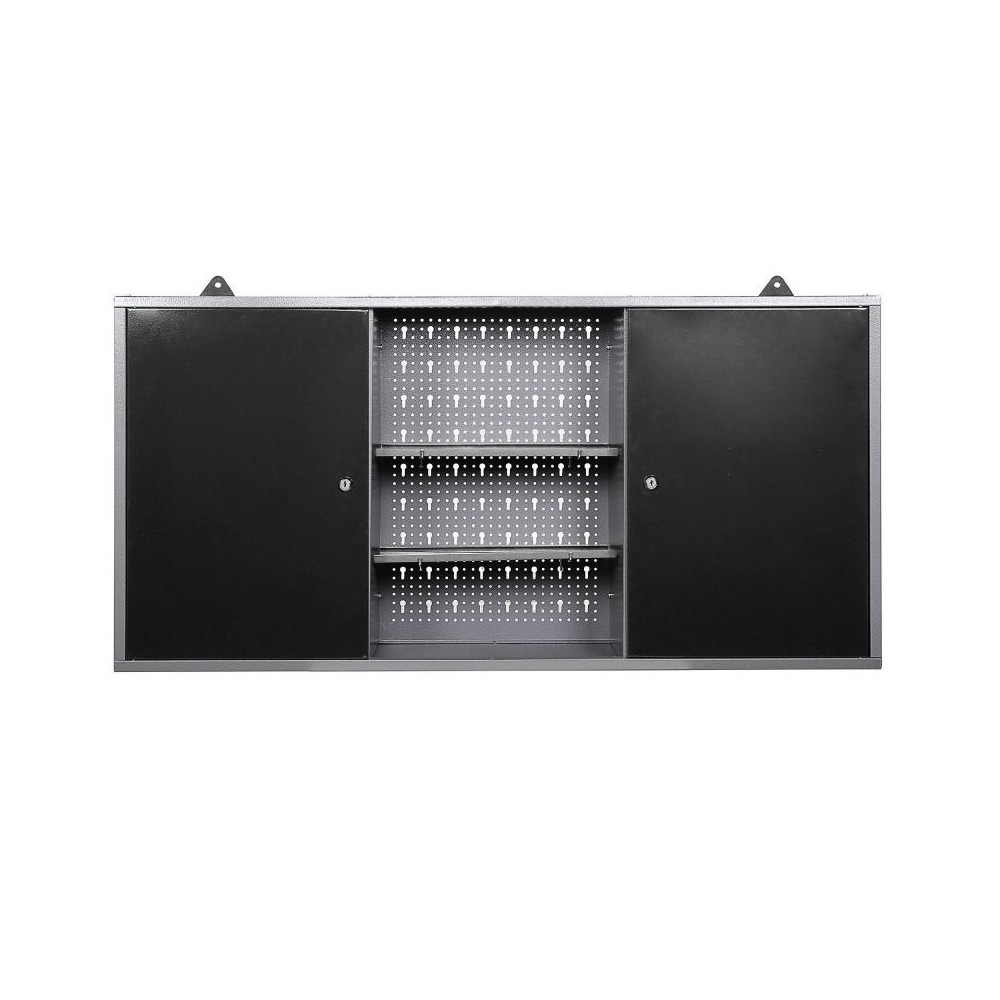 Avatud elemendi vasakul ja paremal pool on kaks suurt lukustatavat kapiosa (kumbki umbes 39,5 x 16 x 58 (K) cm). Siin saate hoida sobivaid tarvikuid, näiteks pastakaid või mutrivõtmeid. Samuti saate turvaliselt hoiustada oma kõige väärtuslikumaid seadmeid ja tööriistu. Tänu lukustatavusele saab kapi suurte ja stabiilsete riputuskonksude abil hõlpsalt ja kindlalt seinale kinnitada. See kaalub vaid umbes 11 kg ja kannab maksimaalselt 50 kg. Selle välismõõtmed on umbes 120 x 20 x 60 (K) cm. See on küpsetatud musta ja halli värvi ning seetõttu kriimustus- ja korrosioonikindel. Tööriistakapp avaldab muljet ka oma lihtsa ja ajatu disainiga.