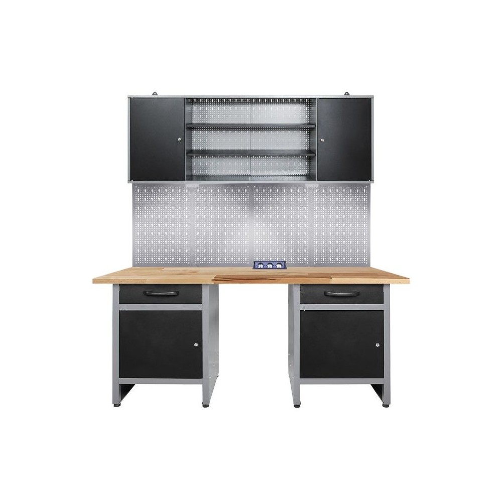 Töökoja varustus 160 cm - töökõrgus 85 cm - koosneb 2 x töölauast (vill 60 cm), 1 x töökoja kapist (160 cm), 4 x perforeeritud seinast, 1 x väljatõmmatavast pikendusjuhest, 2 x LED-ist