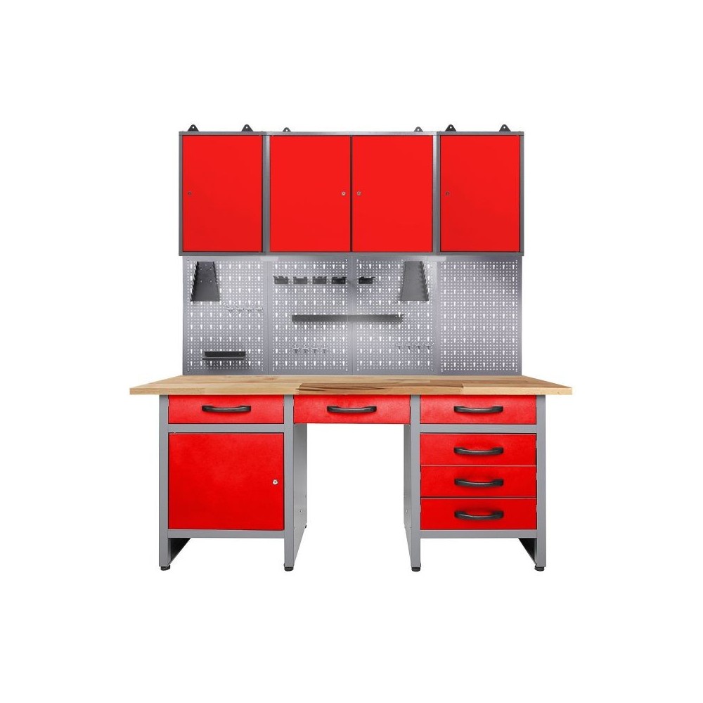 Töökojavarustus 160 cm - töökõrgus 85 cm - koosneb 1 x töölauast (Harry), 3 x töökojakapist (42 cm / 80 cm), 4 x perforeeritud seinast, 1 x perforeeritud seinakonksude komplektist, 2 x LED-ist