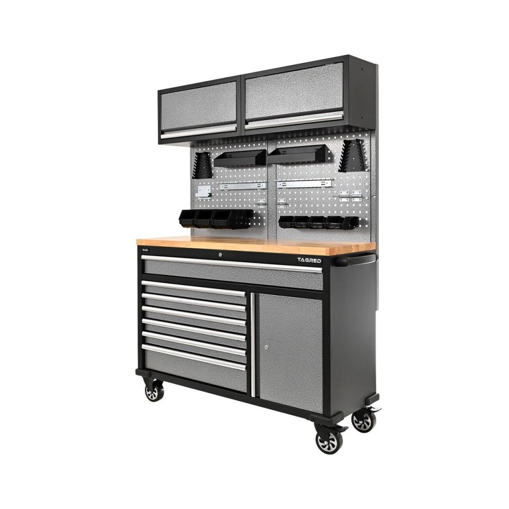 TAGRED PERFORMANCE TA189 töökojamööbel paistab silma läbimõeldud disainiga – suur hoiuruum, täiuslik ergonoomika ja vastupidavus. Komplekt on loodud professionaalsetele tööruumidele, nagu töökojad, teenindusjaamad või garaažid, kus kord, efektiivsus ja tööriistadele lihtne juurdepääs on esmatähtsad. Selle stabiilne konstruktsioon ja funktsionaalsus rahuldavad ka kõige nõudlikumaid kasutajaid.