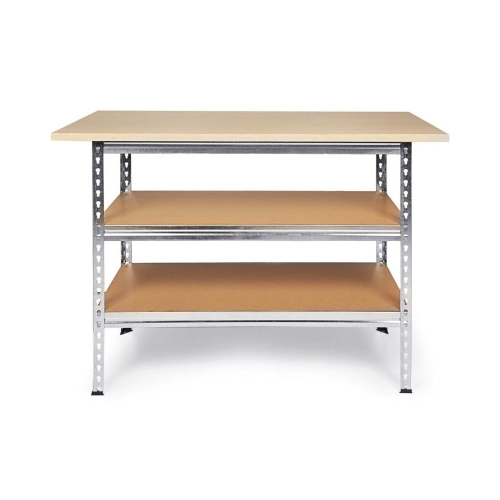 Tööpinna all on kaks suurt panipaika (kogukandevõime 70 kg kumbki), kus saate hoida mahukaid tööriistu või seadmeid, näiteks kastekannu ja puure. Kaks vahelae riiulit tagavad mitte ainult tööpingi suurema stabiilsuse, vaid pakuvad ka palju hoiuruumi, mida saab tõhusalt kasutada ja mis on kõrgusega reguleeritavad. See tähendab, et saate lihtsalt mittekasutatavad tööriistad ära panna ja neid ei pea töötamise ajal häirima. Saate oma tööruumi täielikult ära kasutada.