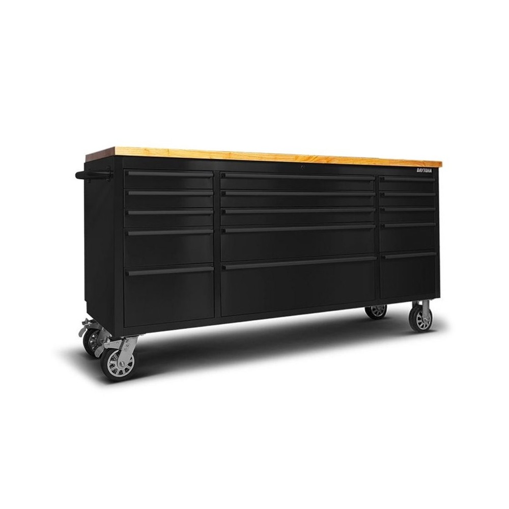 Avastage oma töökojale ideaalne kaaslane – meie kvaliteetne elegantse musta pulbervärviga töökojakäru pakub mitte ainult optimaalset kaitset, vaid näeb ka muljetavaldav välja. Mõõtmetega 46,5 (sügavus) x 182 (laius) x 95 (kõrgus) cm (mõõtmed ilma külgmiste käepidemeteta) sobib see ideaalselt teie töökeskkonda. 15 heldelt polsterdatud sahtliga on teil tööriistade ja tarvikute hoidmiseks enam kui küll ruumi. 30 mm paksune täispuidust pealispind tagab stabiilse tööpinna, mis peab vastu ka kõige nõudlikumatele ülesannetele. Tänu kuullaagritega sahtlijuhikutele, mis taluvad kuni 45 kg raskust, saate nautida sahtlite sujuvat avamist ja sulgemist, muutes teie tööprotsessid oluliselt tõhusamaks. Kaks külgmist käepidet tagavad tööriistakäru hõlpsa manööverdamise, samas kui 4x6-tollised rattad tagavad suurepärase liikuvuse. Lisaks on kaks pöörlevat ratast varustatud lukustuspiduriga, et tagada teie töökohal turvaline asend. Eriline esiletõstetav on musta lakiga sahtli käepidemed, samuti kaasasolevad sahtlisisud ja kaks võtit – esmaklassiline tervikpakett, mis on spetsiaalselt professionaalidele loodud. Optimeeri oma töökeskkonda selle usaldusväärse tööriistakäruga, mis avaldab muljet mitte ainult oma funktsionaalsuse, vaid ka atraktiivse disainiga. Valmistu uueks efektiivsuse ja organiseerituse tasemeks oma töökojas!